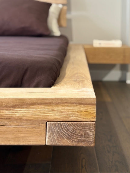 Alle bedden worden vervaardigd uit hoogwaardig massief eikenhout, geselecteerd op structuur, stabiliteit en duurzaamheid. Het natuurlijke hout zorgt voor warmte, karakter en een tijdloze uitstraling. Elke plank is uniek. Met nerven en noesten die jouw bed een authentieke uitstraling geven. Dankzij de ruimte keuze aan kleuren en afwerkingen stem je het bed moeiteloos af op jouw woonstijl, van modern minimalistisch tot landelijk en warm.
